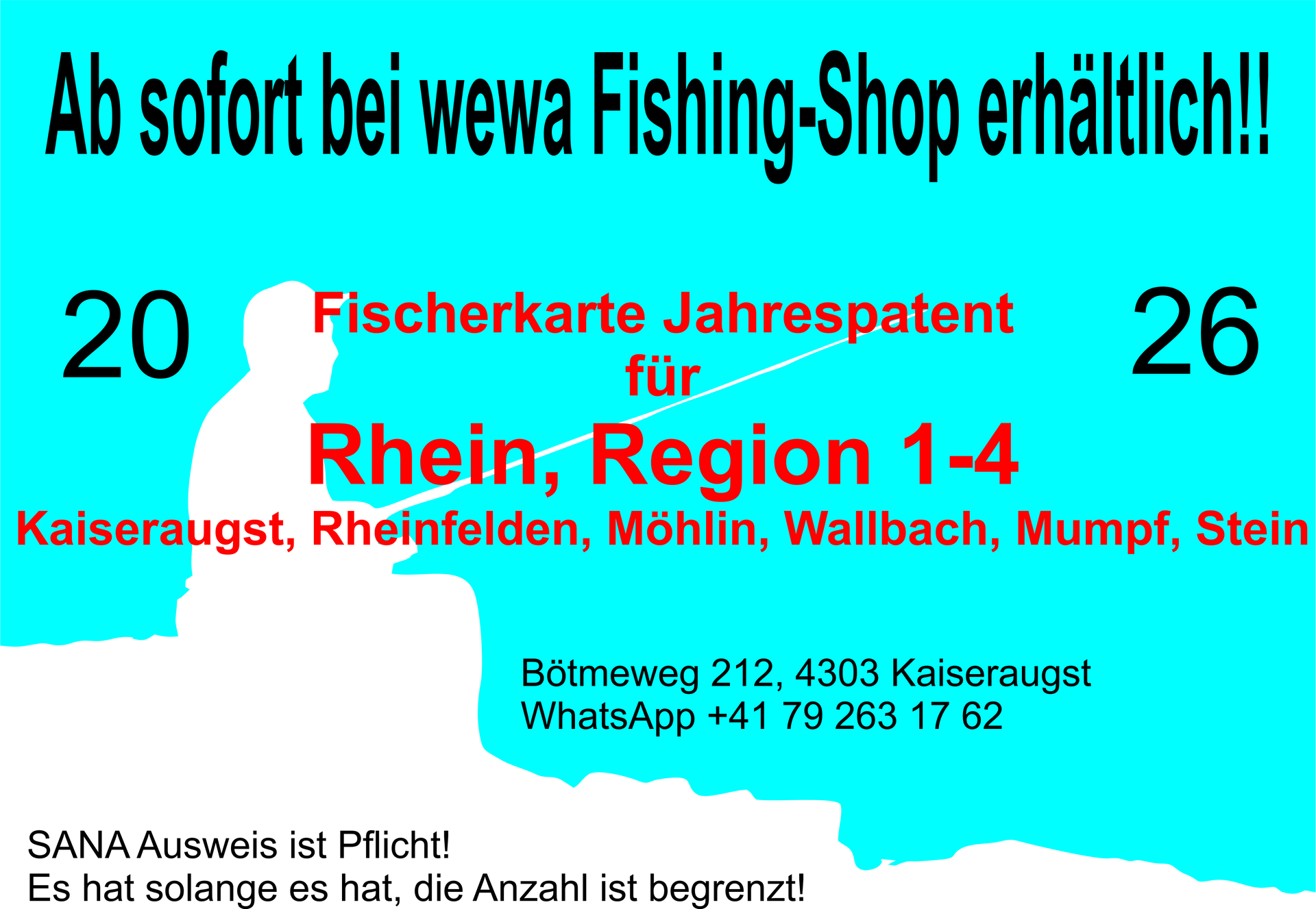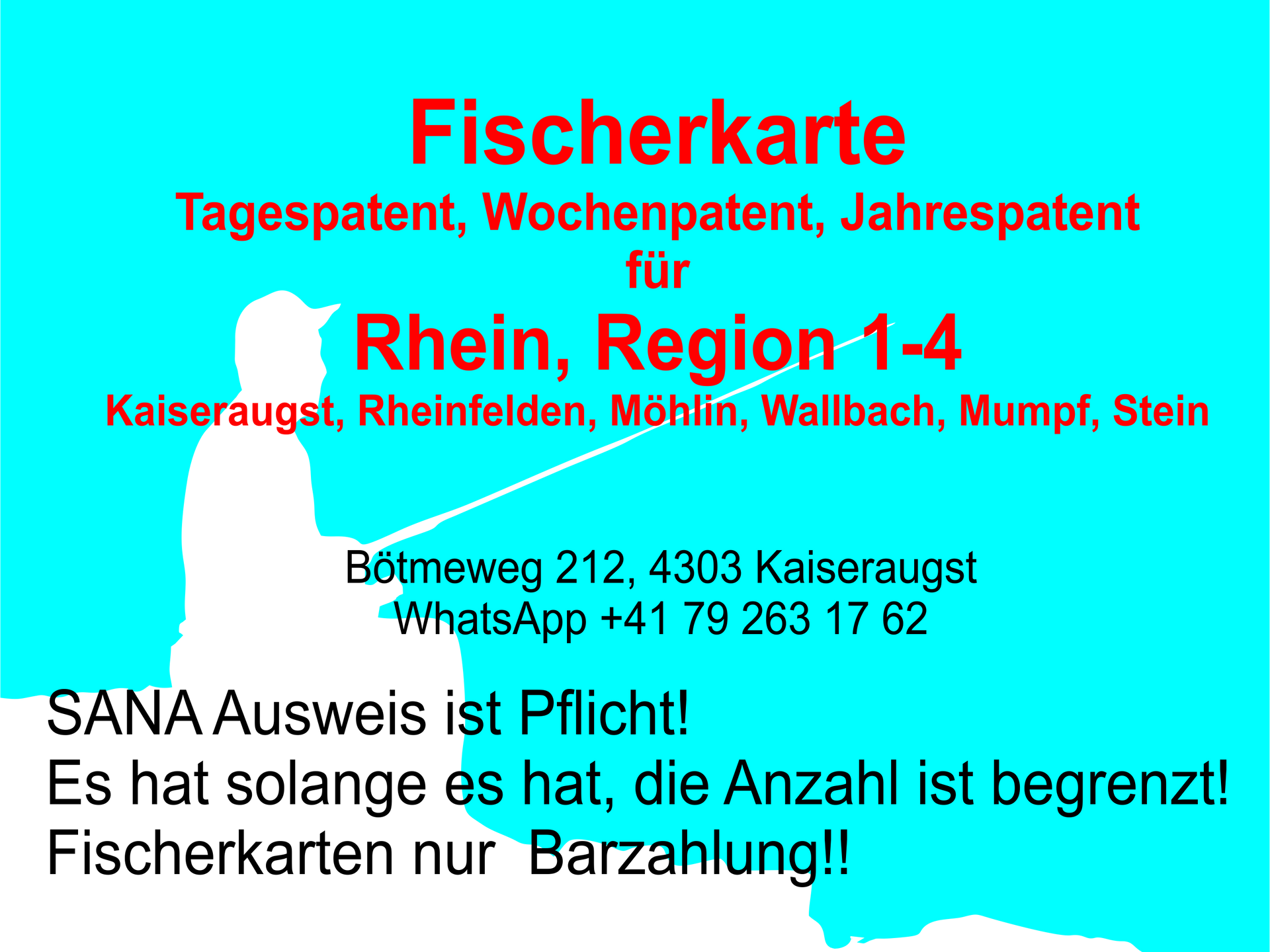 Besorgen Sie sich bei mir Ihre Fischerkarten für die Rhein Region 1 bis 4 (Kaiseraugst, Rheinfelden, Möhlin, Wallbach, Mumpf, Stein)